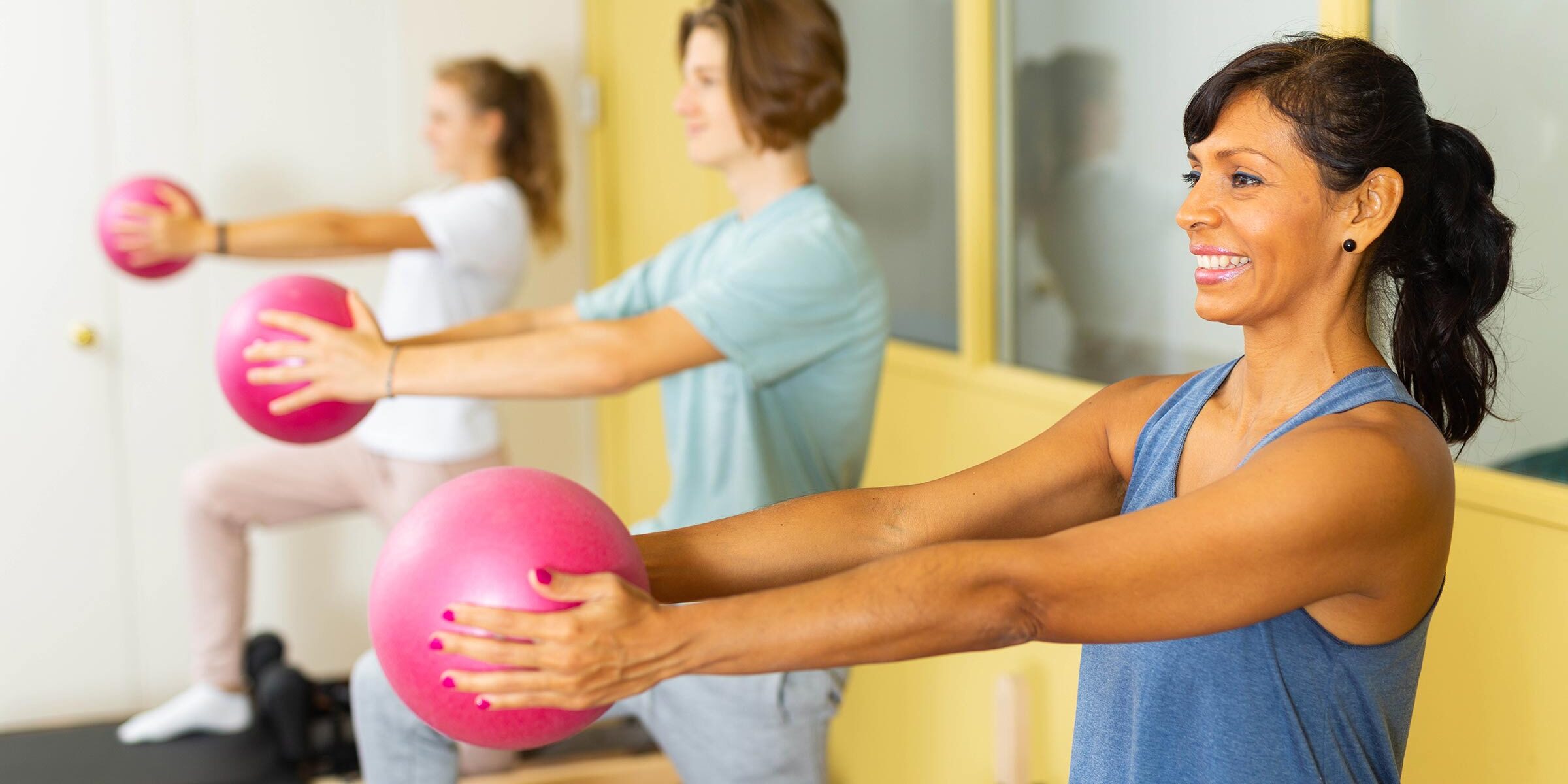 Pilates is a mindful exercise that promotes control of both the body and mind through a relaxed, focused approach. Many classes incorporate equipment such as the Reformer, Jump Board, resistance bands, and classic Pilates rings to enhance the workout. Typically practiced in small groups with an instructor, Pilates encourages participants to stay present, which can support mental well-being and self-care.
